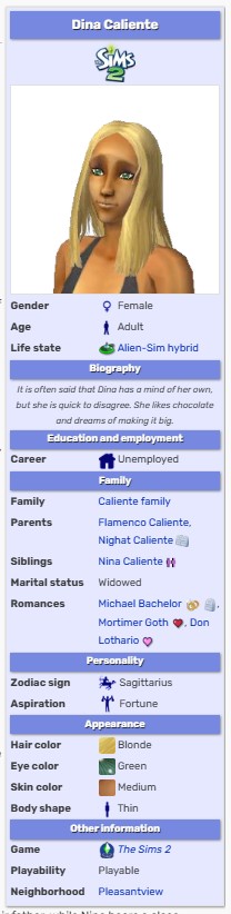 니나는 칼리엔테 가문의 딸이자 다이나의 쌍둥이 자매다.