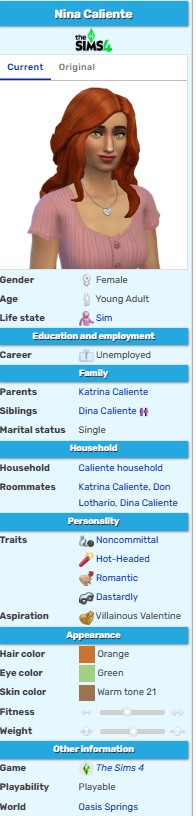 딸 니나 칼리엔테는 자유분방하고 충동적인 성향을 지녔다.사랑과 장난, 그리고 위험한 선택 사이를 가볍게 오가며,이 집 안에서도 가장 예측하기 어려운 변수로 남아 있다.