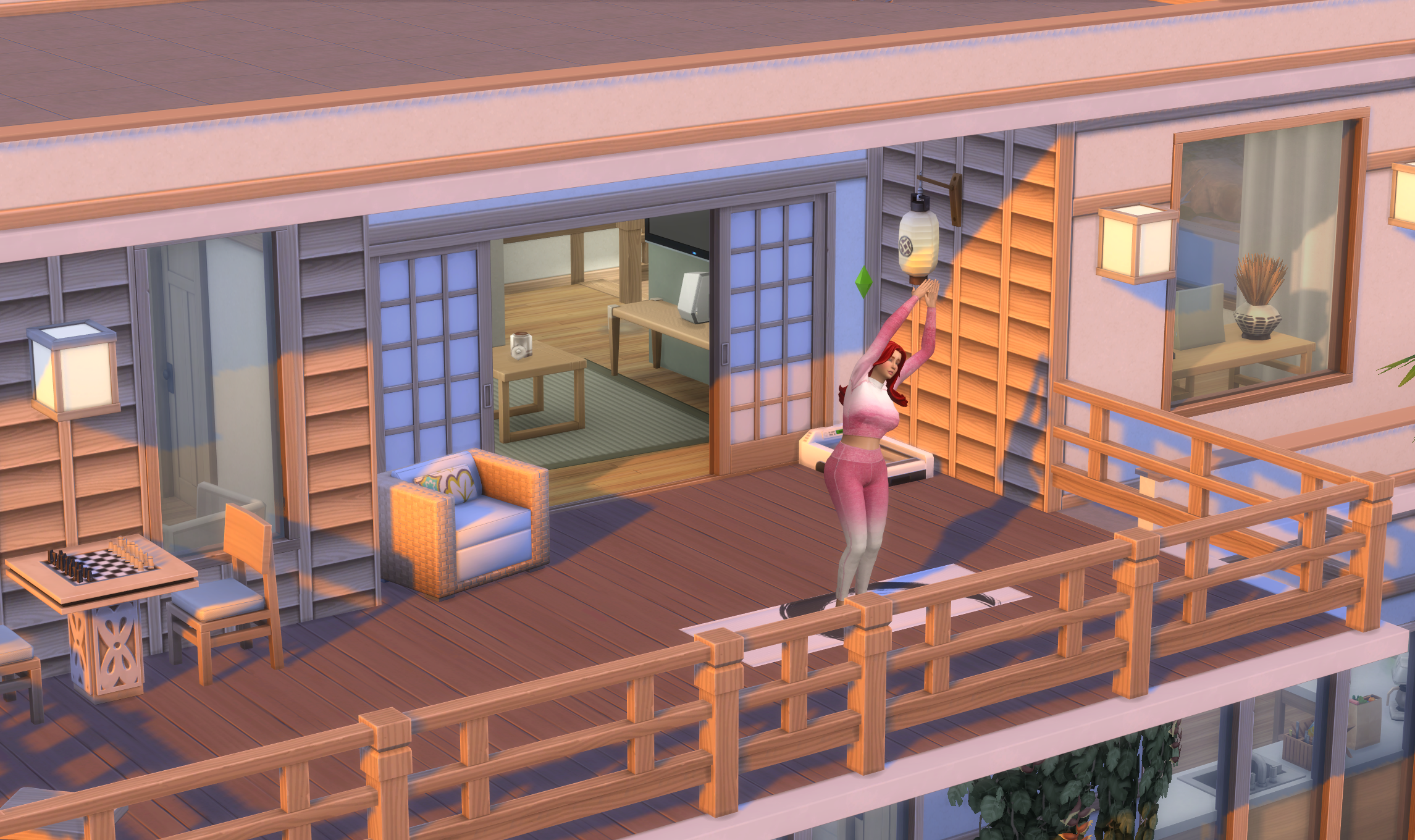2층 테라스가 길게 펼쳐져 있고,나무 난간 너머로 산과 단풍이 이어진다.